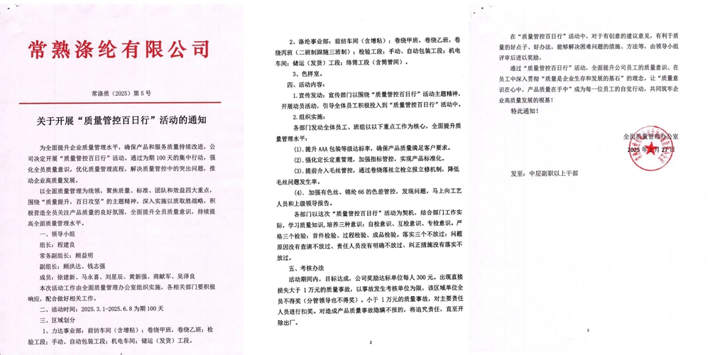 A qualidade é a linha de vida das empresas, e Changshu Polyster realizará o "Tour de cem dias de controle de qualidade" como uma oportunidade para solidificar a experiência e as práticas nas atividades em um mecanismo de longo prazo, construir continuamente uma base sólida de qualidade e fornecer aos clientes melhores produtos.